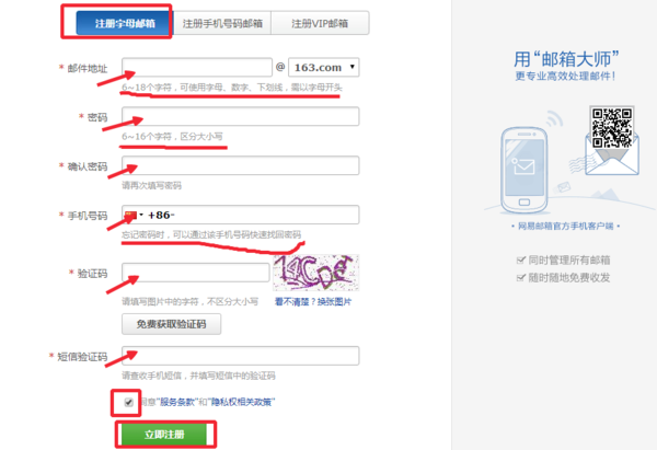 4、在注冊郵箱時一定要按照上面提示的要求進行注冊,全部輸入完畢后點“立即注冊”就創建了自己的郵箱了;